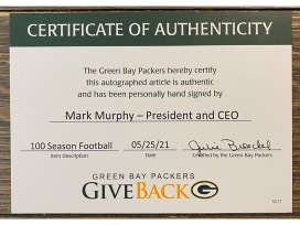 Take home your very own NFL 100 year anniversary signed football by Green Bay Packers' President Mark Murphy. Item will include a COA. *Winner will be responsible for shipping expense.