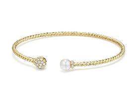 18KT Yellow Gold 6mm Solari Bracelet with Pearl and .21ct pave diamond bead. Size Medium