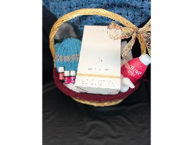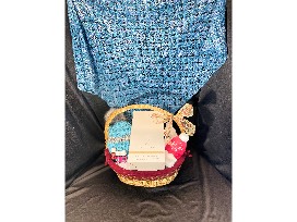 This set features a handmade blue shawl and stocking hat with a fuzzy ball.