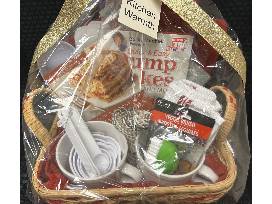 2 cookbooks, handmade knitted wash clothes, cutting board, 2 tea towels, 2 soup bowls, and measuring spoons with cups.