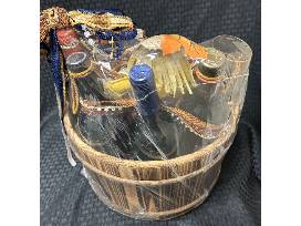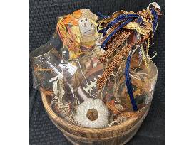 A wooden basket with 2 fall wine glasses, 1 ceramic pumpkin decor, napkin fall leaf's, scare crow, decorative ribbon, a cork bottle stopper, and "It's not fall without football" wooden decor. Included in the fall basket is 4 bottle's of wine.