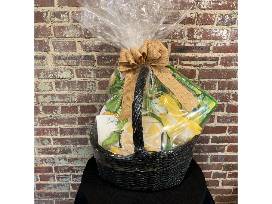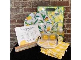 Everything is coming up lemons! This swag bag includes a lemon cutting board, a lemon apron, a small lemon serving tray, 2 yellow gingham checked dish towels, a bottle of citrus hand soap, and a sign that says "Easy Peezy Lemon Squeezie!"