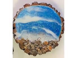 Handcrafted wood slab with acrylic paint, authentic Lake Erie sand and shells, and sealed with epoxy resin waves by Michael Wilson II
