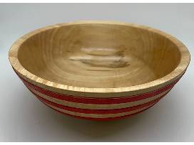 Maple turned wooden bowl with red textured stripes by Fritz Brandau