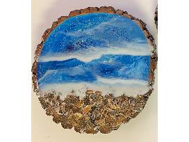 "Handcrafted wood slab with acrylic paint, authentic Lake Erie sand and shells, and sealed with epoxy resin waves by Michael Wilson II