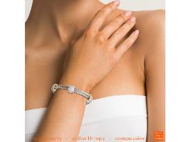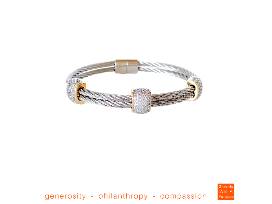 Add glamour to your day with this flattering stackable bracelet. Once you own it, it will sure become your "go-to" piece! Hypoallergenic, stainless cable with rhodium and yellow gold overlay. Three zirconia crystals micro-pavé stations and magnet closure. Standard size to fit most wrists. Outstanding packaging for storing and for travel. Created exclusively for the nonprofit community!