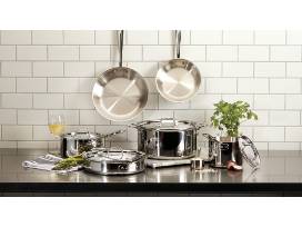 Professional-grade, triple-ply pans from All-Clad are made with an extra-thick, pure aluminum core that extends from the bottom all the way up the sides for superior heat performance. Bonded to the aluminum core each piece has a hand-polished stainless interior with starburst finish that won't react with food. Tight-fitting stainless lids lock in heat, moisture and flavor, adding steaming, braising and warming capabilities to the mix. The long, securely riveted stainless handles stay cool while cooking.