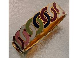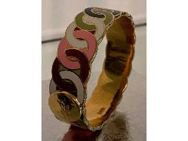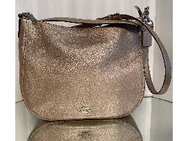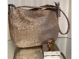 Talk about putting your best shoulder forward! Take a look at this stunning metallic gold, soft leather Coach shoulder bag. All the luxury that goes with the name Coach. Top your fashion statement off with a colorful Coach logo bangle bracelet.