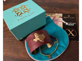 This package includes a beautiful Texas leather cuff bracelet, a lovely Texas-made Calyan Wax Co Soy Candle in Apples & Maple Bourbon scent, and a tasty bottle of Hill Country's William and Chris Vineyards Red Blend.