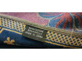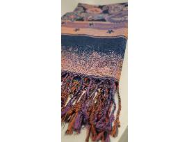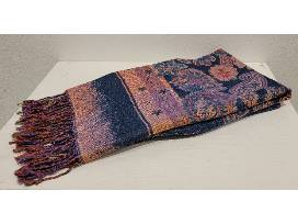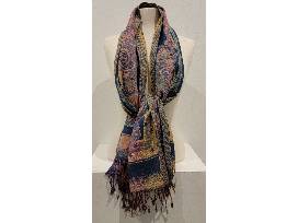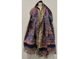 This 50% wool and 50% viscose fringed shawl features an intricate woven floral pattern similar to those often seen in pashmina and faux pashmina shawls.