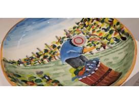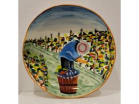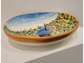 The harvesting of grapes to make wine, a long sought after tradition in Italy, is beautifully reflected in this handpainted Tuscan scene on a handcrafted shallow serving bowl.