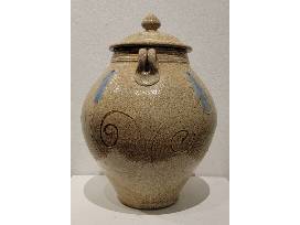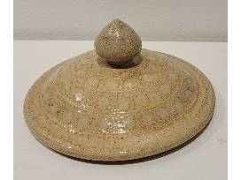 Enjoy this covered vessel with strap handles and peaked finial by local potter Mark Hewitt! Includes a postcard featuring a photograph of the pot being thrown.