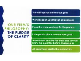 Clarity Legal Group's approach takes the uncertainty out of decisions about estate planning and elder law. Before you engage with their services, they will provide clarity about what is needed, what the options are for preparing more fully, how and when the plan will be delivered and implemented, and what will be expected of you during the process. They will prepare you even before you decide to work with them through education in multiple forms, calculated to make the time you invest productive and the decision to use their services clear and easy.