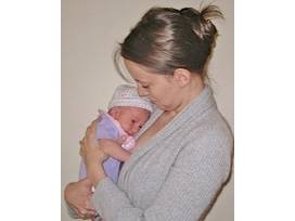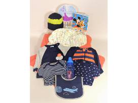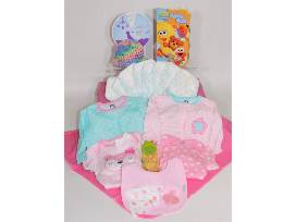 Layette Kit contains a new receiving blanket, clothing, diapers, bottle, pacifier, bib, washcloth, baby book and knitted hat.