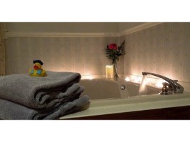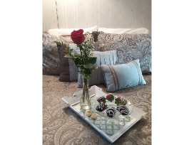 The Romantic Retreat Suite offers an in-room bath with a jacuzzi for two, separate shower, comfortable love seat, air conditioning, flat screen television, DVD player (complimentary movies), hair dryer, Wi-Fi, ice buckets, mini fridge, embroidered spa robes, fluffy towels and king bed with high thread count linens, & plenty of pillows.