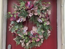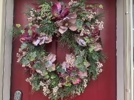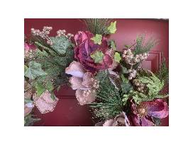 Bordine's Burgundy and blush pink Magnolia Holiday wreath highlighted with gold accents and blush gold berry clusters. 33"