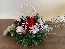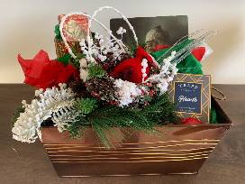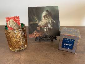 Metal bin filled with a Santa Tile with iron stand, a beautiful Cardinal centerpiece and a golden candle holder with Christmas matches and a TRAPP Hearth Candle.