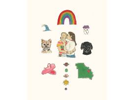 An 8x10 color custom "portrait" from Portrai Me and a gift card to Framebridge for custom framing. Portrai Me is a visual art project that creates 'portraits' of people's personalities through the various motifs in their lives. The project is a celebration of diversity, a way to express gratitude for the people and things we cherish, and an exploration into the ways our material world informs our psychological world.