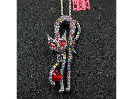 Betsey Johnson cat pendant Includes multi colored crystals all over her body with red crystal eyes and a red crystal ball. She is 3" tall and 1" wide. Looks great with a sweater.