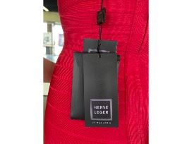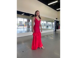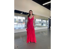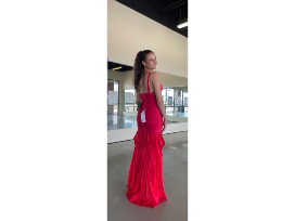 1Bandage evening gown with ruiffled chiffon skirt, V neckline. Fitted through hips. Hidden back zipper. Floor length hem.