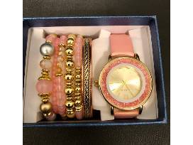 Three beautiful pieces of costume jewelry. Pink bracelet set with matching watch and two additional bracelets.