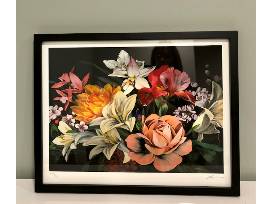 This is a limited-edition signed fine art print of a floral design by nationally renowned muralist Louise "Ouizi" Jones, titled "Adaptation Nocturne." Printed with archival ink on 14x18-inch 300 gsm Moab Entrada Rag. The Certificate of Authenticity on the back indicates this is number 380 of 500. It is signed by Ouizi and dated May 30, 2020.