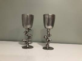 Two vintage Don Drumm one-of-a-kind goblets and a bottle of wine.
