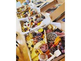 12" x 12" charcuterie board by the fabulous 'Cheeses for the Keitzes' along with one bottle each of Chardonnay, Sauvignon Blanc and Pinot Noir. The board can be customized with different cheeses, meets and treats.