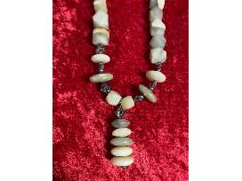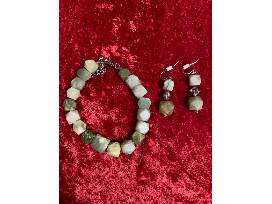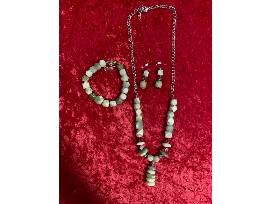 0This jewelry set includes a necklace, a bracelet and earrings to match. All three items are made of differing shade of green stone. It measures 13" when held strait from clasp to bottom of pendant. The clasp is adjustable on both the neck and bracelet. The bracelet measures to a maximum length of almost 10".