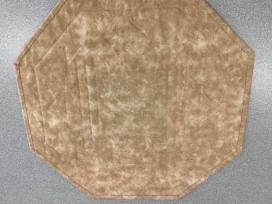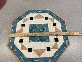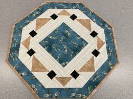 This hexagon shaped quilted piece has a square center piece of blue dragonfly fabric, surrounded by ecru, black and golden-brown piecing and the dragonfly print as a border. The back is golden brown. The topper is 18" wide.