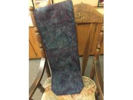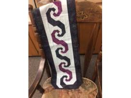 This elegant quilted table runner has a purple and black/purple snail's tail pattern on a white background. It is bordered and backed by the same black/purple print. This runner is 41" long by 12 ½" wide.