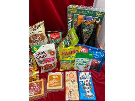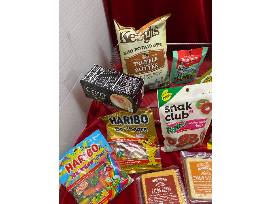 - Assorted World Market gourmet snacks including sweet treats like Haribo, Kit Kats, gourmet chocolate bars, Snack Club gummies, as well as salty delights like pickle chips, truffle potato chips, wasabi dried edamame, and cheese and crackers