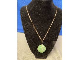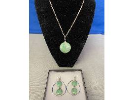 These jade-colored stones are strung on silver-toned wire, chain and beads. The24" necklace has a 1" round stone on a silver chain with a safety clasp. The 2" earrings have 2 stones inside a silver hoop. FMV $30.00 Donated by Gail Schwab