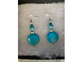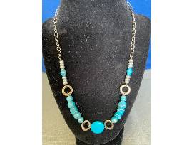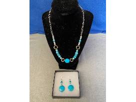 This set has turquoise- colored beads in various shapes and sizes, set with silver colored beads and silver chain. The necklace is 20" long and the earrings 2 inch dangle pierced earrings have wires. FMV $20 Donated by Gail Schwab