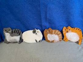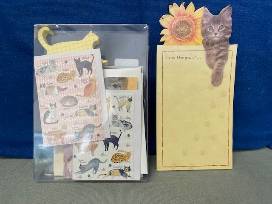 Relax with your kitty with a cup of tea. Bone China large World of Cats mug by Dunoon, a box of Cat Whiskers note cards, 4 felt painted cat coasters, a kitty tea bag holder, a pad of cat note paper a pack of cat paw emery boards, a box of herbal tea bags, 2 cat design dish towels which can be displayed on the cat design over-handle holder. Also includes a pair of silver cat head stud earrings.
