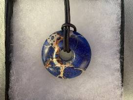 Here is a casual necklace - a polished rock "doughnut", dark blue with beige viening. It is strung on a 22" black leather cord. FMV - $15.00 donated by Gail Schwab