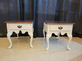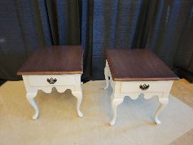 Won't these two end tables be lovely flanking your sofa? This dynamic duo brings the warmth of stained wood with a pop of brightness from the fresh oatmeal paint on the cabriole legs.