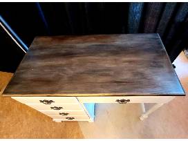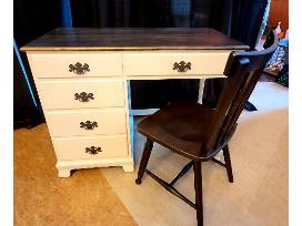 This beautiful piece of maple furniture with 5 drawers can be used as a Desk or a Vanity.... your choice. The top is painted in a luxurious metallic bronze and the drawers and legs are an oatmeal color