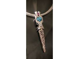 Original design palladium silver pendant with natural blue zircon, pink Sapphire and diamonds with a silver and copper mokume-gane dangle.