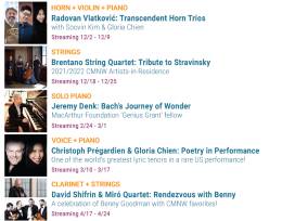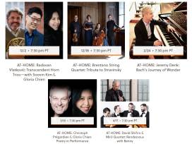 You're bidding on an AT-HOME Concert Series Pass to enjoy five Chamber Music Northwest 2021/22 Season concerts from the comfort of your home! You'll see Radovan Vlatkovic: Transcendent Horn Trios-with Soovin Kim & Gloria Chien (French horn, violin, piano), Brentano String Quartet: A Tribute to Stravinsky (strings), Jeremy Denk: Bach's Journey of Wonder (solo piano), Christoph PrĂ©gardien & Gloria Chien: Poetry in Performance (voice, piano), David Shifrin & MirĂ³ Quartet: Rendezvous with Benny (clarinet, strings).
