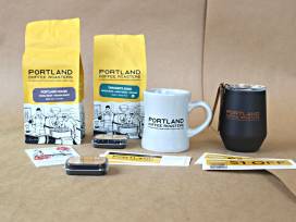Donated by Portland Coffee Roasters: "Since our founding in 1996, Portland Roasting Coffee has sourced our coffee directly from farmers while building sustainable relationships with them and the communities they support. For more than 20 years we've worked to create lasting connections extending from our local community to our farmers, our customers and partners. These connections are at the heart of our business, and allow us to focus not just on coffee, but on improving both people and planet."