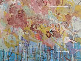 1Tiffiny Boyd has worked at the ECF Art Centers since 1990 and currently works out of the San Pedro studio. Tiffiny's work is inspired by expressive qualities of color, the freedom of intuitive mark-making, and self-exploration of creative processes. Boyd draws from her infinite imagination to create effervescent and abstract and floral designs that often play with conventions of spatial orientation. Working primarily with acrylic paints on canvas, she paints with an energetic, determined hand using a variety of brushes, tools, and consistencies of paint. Her compositions culminate in layers of repetitive swirls, drips, swells and gestural marks.