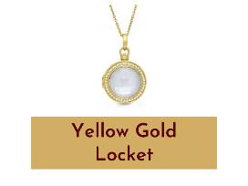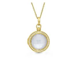Locket Description: Yellow gold plate sterling silver Michael Locket with 44+022Tw round diamonds and round Mother of Pearl/White Quartz doublet on 18" chain.
