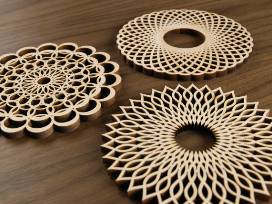 Five Ply Designs coasters with original artwork which provide both function and beauty to your home! Use as coasters, coffee table art, or decorate your wall with these unique handcrafted pieces. A set of 6 coasters with two of each design. Original artwork is drawn by hand and laser cut from 3/16" thick Basswood. These 3.9" diameter coasters are unsealed and unfinished so they actually absorb the moisture from your cocktails and will take on a natural patina of use and love of the drink.