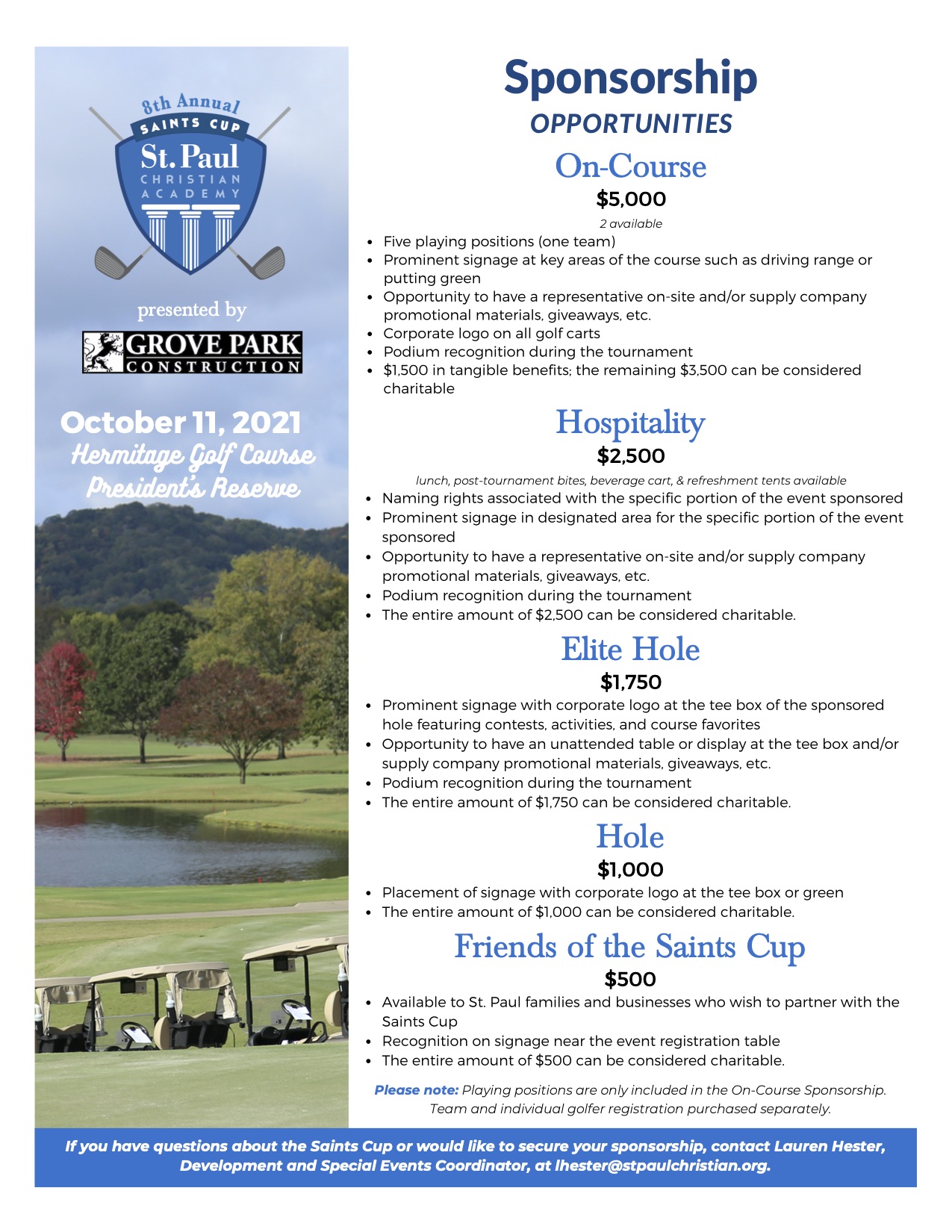 The 8th Annual Saints Cup Golf Tournament presented by Grove Park Construction, benefiting St. Paul Christian Academy, will take place at Hermitage Golf Course on Monday, October 11, 2021. Over the last seven years, the Saints Cup has provided over $320,000 to support special projects and provide vital resources that affect St. Paul students. Players will experience a top-notch tournament, which includes complimentary beverages, meals, and premier tournament gifts.