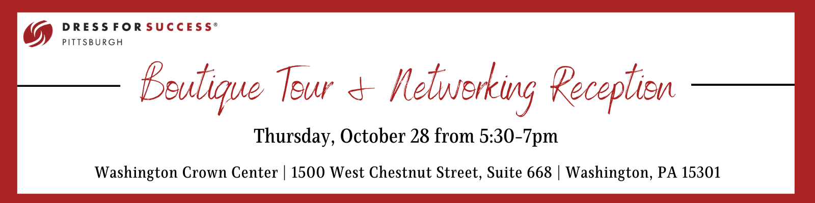 Join us at the Washington Branch of Dress for Success Pittsburgh's new location in the Washington Crown Center on Thursday, October 28 from 5:30-7pm for a boutique tour and networking reception. Guests will learn more about the organization's mission to empower women in the workforce and ways to get involved as we work to recover from the pandemic. A ribbon cutting ceremony will take place promptly at 6:00pm. Light refreshments will be provided. Registration is required.