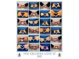 The 7th grade students in Mrs. McDonald & Mrs. Vicenteno's classrooms worked together to create a beautiful artwork of hearts. The hearts are formed by the hands of these amazing students and set atop a colorful background and is framed. This work of art will remind you that faith, hope and love are three things that last forever.
