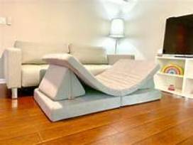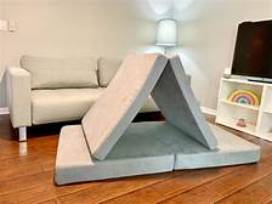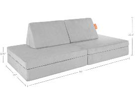 The infinitely configurable play couch made up of four foam pieces (base, cushion and two triangular pillows) covered in a microsuede fabric.