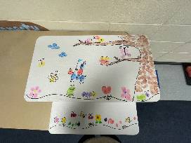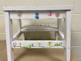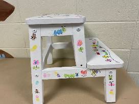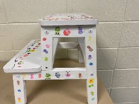 Step right up and bid on this must have piece! Every child's home needs a step stool. This is the perfect one filled with colorful fingerprint art from the entire preschool class. This step stool is sure to leave an impression in your home and in your heart.