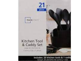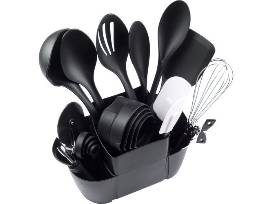 Make cooking faster with a complete Mainstays Kitchen Set. It has almost every kitchen tool you need for breakfasts, lunches and dinners, whether you're feeding one or two or the entire crew. The 21 pieces in the Mainstays kitchen set are a mixture of durable metal, nylon and rubber utensils, so they're safe to use with almost any cooking surface. The set includes a peeler, can opener, nylon turner, nylon slotted spoon, two spatulas, set of four measuring cups, pizza cutter, whisk, nylon spoon, nylon ladle, set of two mixing spoons and set of four measuring spoons. The kitchen utensil set is dishwasher safe, and it comes complete with a convenient kitchen caddy that saves space and keeps your tools organized.